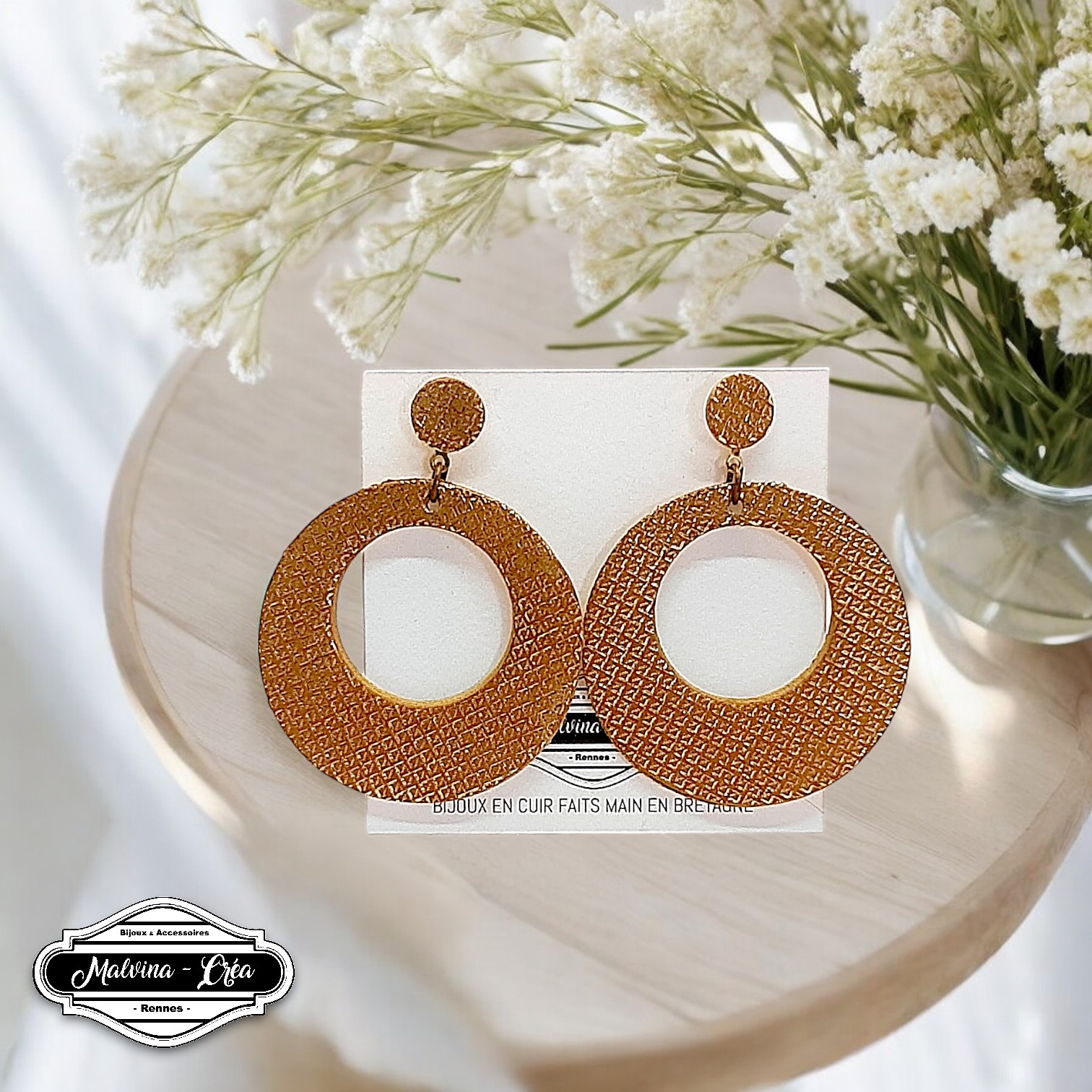 boucles d’oreilles – VALENCIA- en cuir marron et doré motif- support clou d’oreilles–1